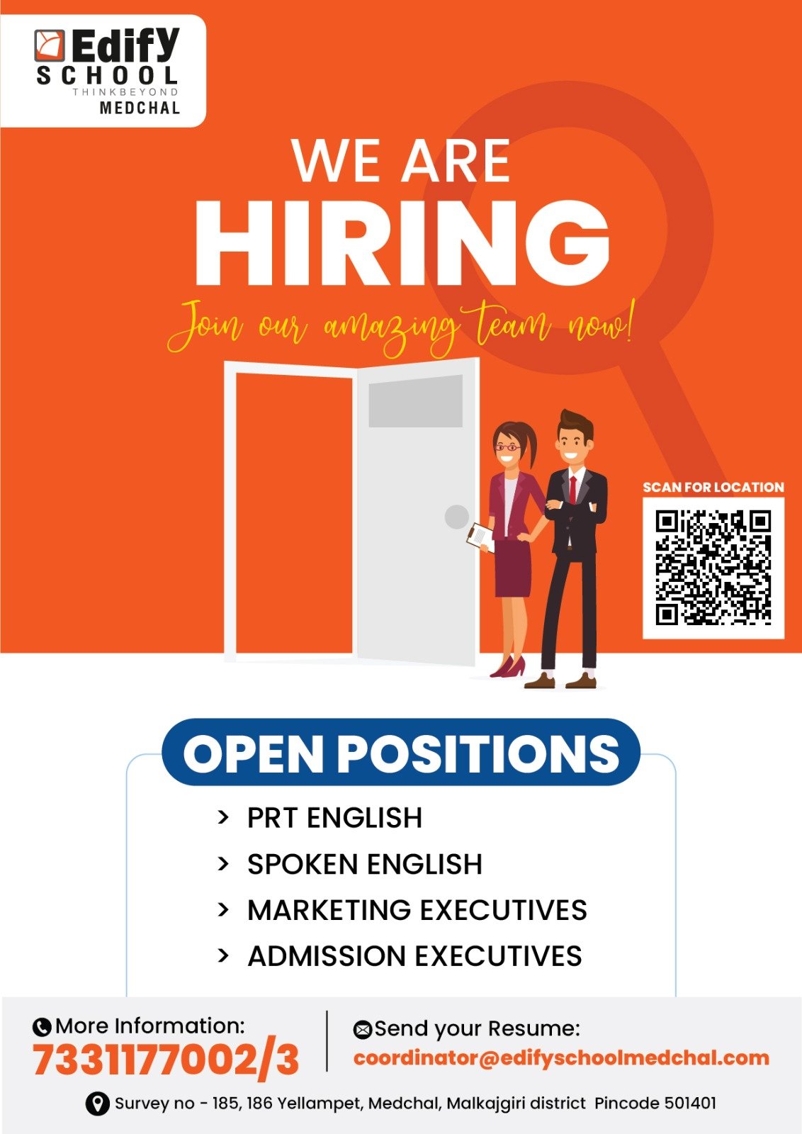 Edify School Medchal, Hyderabad is looking for professionals to provide world-class education and support to our students. We invite applications for both Teaching and Non-Teaching Positions in various departments. If you are passionate about shaping young minds, supporting educational excellence, and contributing to a vibrant school community, we want to hear from you!